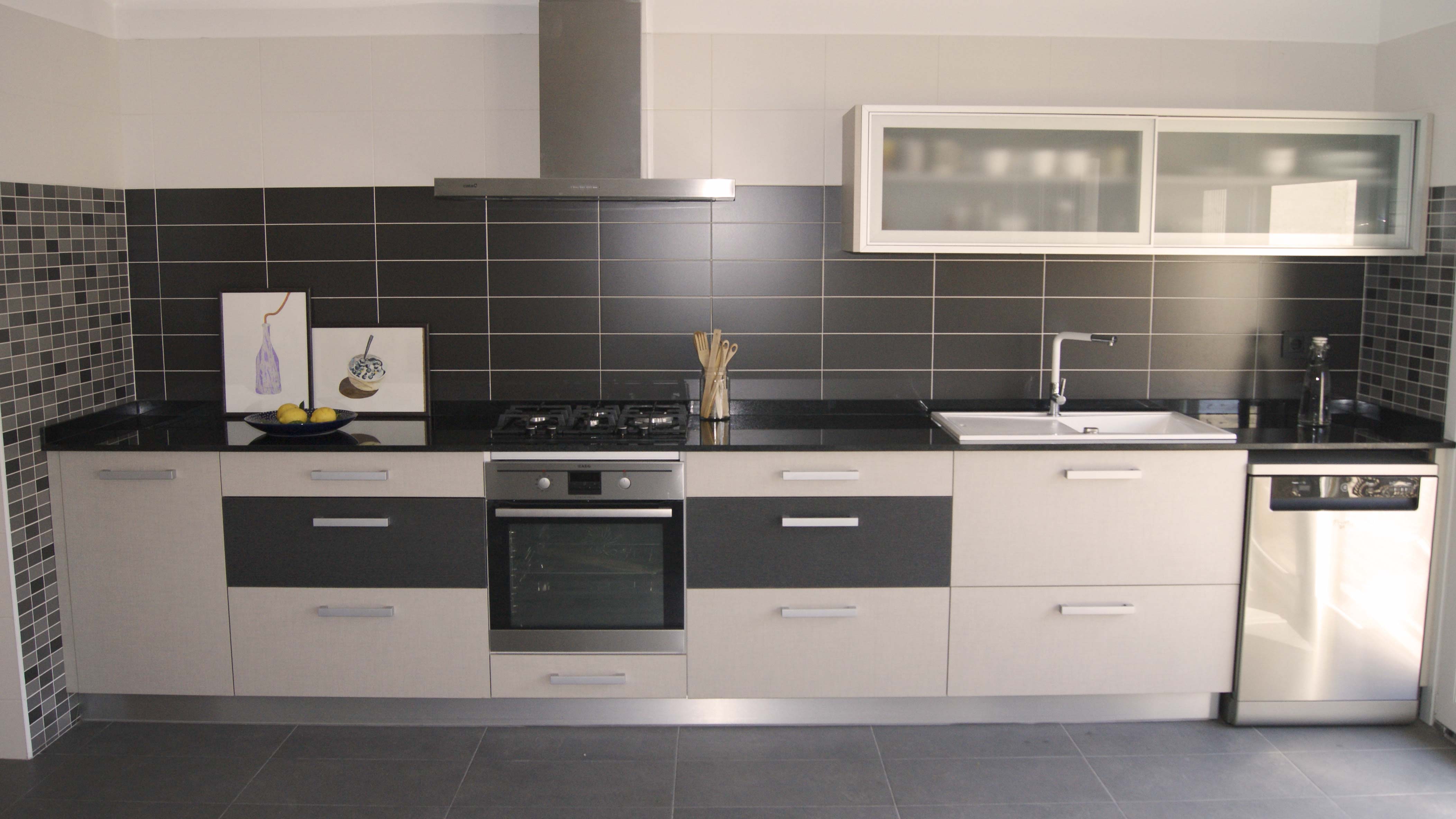 Se juega con el revestimiento de las paredes, con azulejos rectangulares de dos formatos, haciendo contraste con tonalidades cromáticas de gris, desde el gris más oscuro al gris más claro.